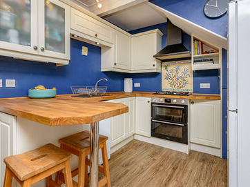 Kitchen/diner fitted with a range of floor and wall mounted units, gas hob and double oven, white goods which are included and log burner