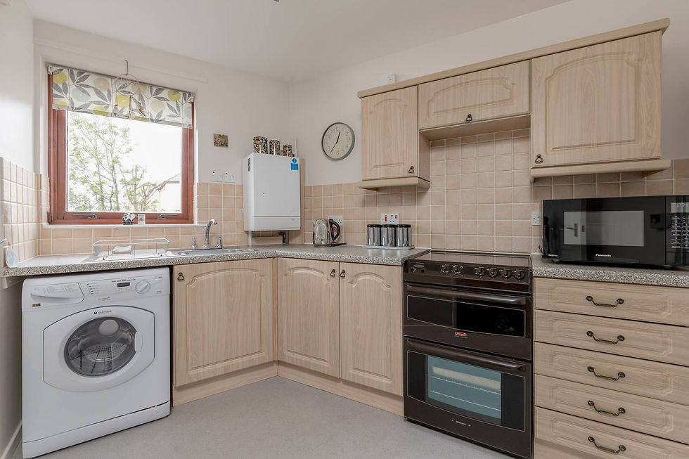 The accommodation comprises a spacious living and dining room, featuring fulllength windows that flood the space with natural light, creating an ideal setting for relaxing or entertaining friends and family. The kitchen is well equipped with a range of floor and wall-mounted units, an electric cooker, with white goods included in the sale. There are two double bedrooms, both benefiting from wardrobes that provide excellent storage. The shower room is fitted with a modern two-piece suite and a mains-powered walk-in shower. Further benefits include gas central heating, double glazing throughout, and a large storage cupboard located in the hallway. Externally, the property enjoys well-maintained communal gardens and an allocated parking space.