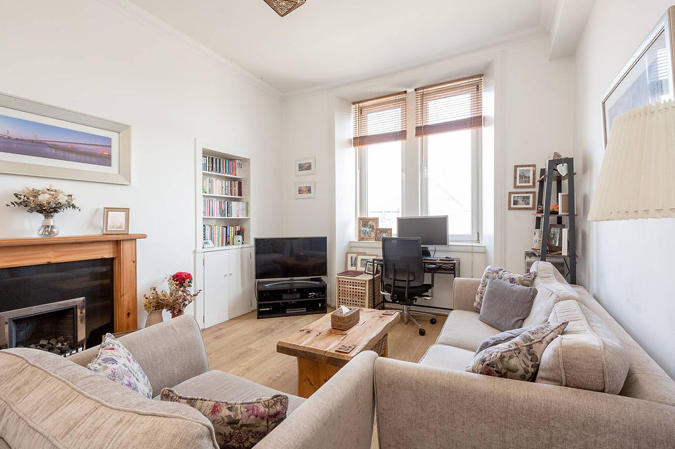 Offering a well-balanced and thoughtfully laid out interior. the accommodation opens with a welcoming entrance hallway, complete with a useful storage cupboard, ideal for everyday convenience. The lounge and dining area enjoys plenty of natural light from dual-aspect windows, creating a bright and airy feel while a charming decorative fireplace and traditional Edinburgh press add character and a touch of period charm.
